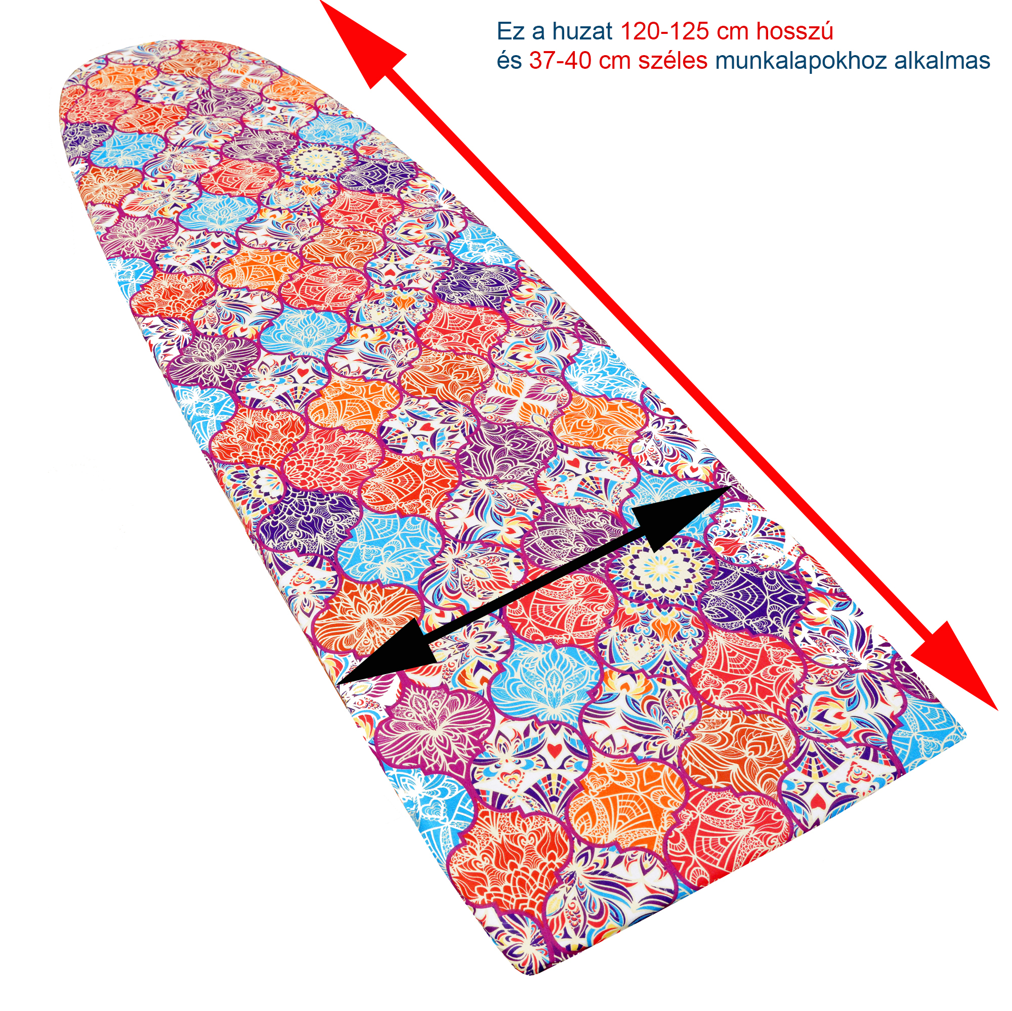 TOK a vasalóasztalhoz, rugalmas szegéllyel, 100% pamut, 10 mm vastag szivacsréteg. Ez a tok 120-125 cm hosszú és 37-40 cm széles munkalapokhoz alkalmas.